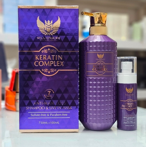 شامپو کراتین ضد ریزش مو حجم 750 میل + همراه با اسپری ترمیم کننده مو حجم 100میل (Keratin Complex)
