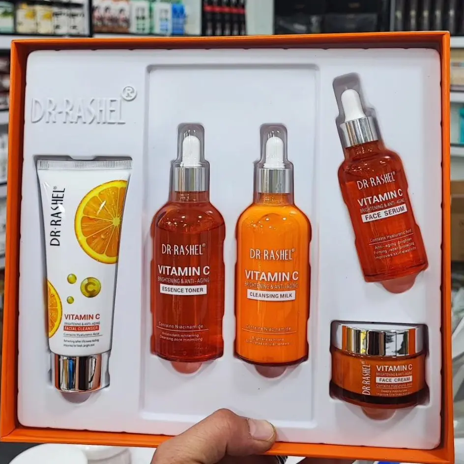 پاک کننده صورت ضد پیری ویتامین C سرم صورت روشن کننده و ضد پیری ویتامین C کرم روشن کننده و جوانسازی ویتامین C تونر روشن کننده و رفع چروک ویتامین C شیر پاک کن ضد پیری ویتامین C تاریخ انقضا 2026 شامل 5 محصول مورد نیاز پوست