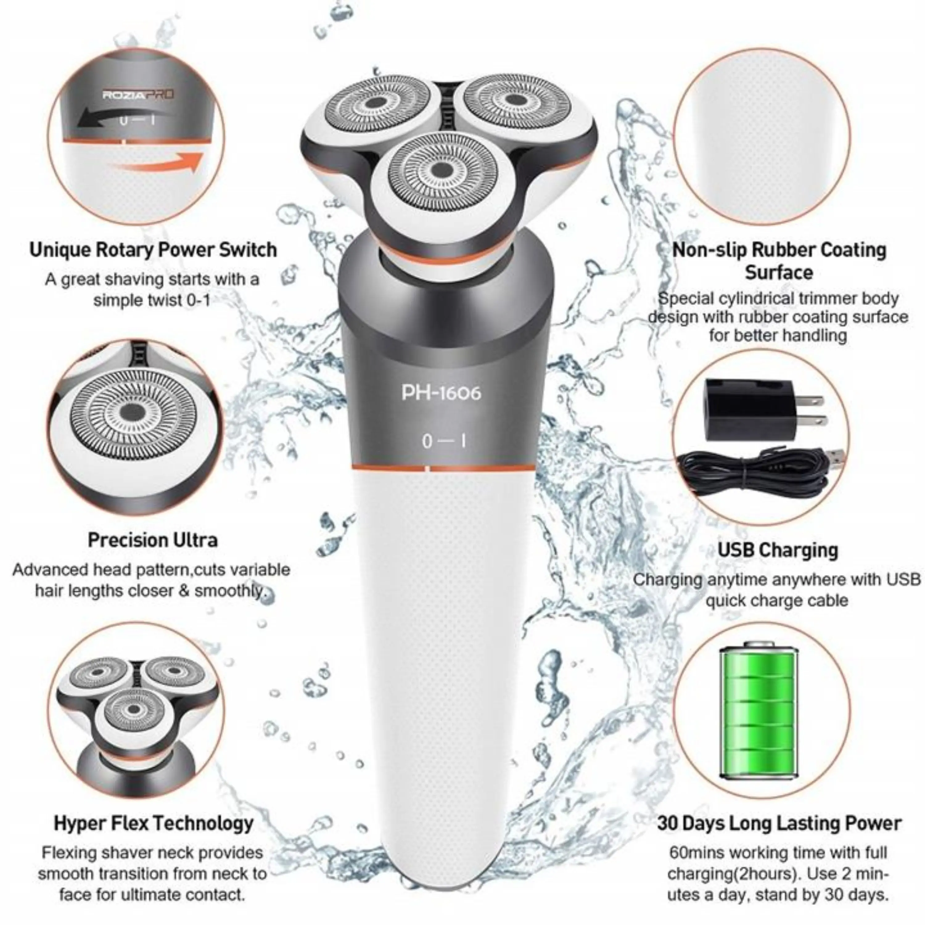 : ضد آب و قابل شستشو : قابلیت اصلاح به صورت خشک و مرطوب : قابلیت شارژ سریع : ساخت کشور هلند تکنولوژی اصلاح: برش مستقیم، برش چرخشی جنس تیغه: استیل پیشرفته قابلیت اصلاح با شماره صفر: دارد قابلیت خط زن: ندارد قابلیت شستشو: دارد منبع تغذیه: باتری قابل شارژ (بی سیم) شامل 5 سری چرخشی: اصلاح ریش اصلاح موهای سر و صورت سری موزن گوش و بینی سری اصلاح موهای بدن یک عدد شانه با امکان تغییر سایز از ۱ میلی متر تا ۲۰ میلی متر مهمترین ویژگی هایی که در این دستگاه به چشم میخورد قابل استفاده بودن دستگاه بصورت تر و خشک و زیر دوش است. همچنین می توان به همراه دستگاه از فوم و ژل اصلاح استفاده کرد. تکنولوژی برش ماشین اصلاح چند کاره فیلیپس بصورت مستقیم و چرخشی می باشد. سری های اصلاح سر و صورت، و بدن ریش تراش چند کاره فیلیپسموها را همانند خودتراش اصلاح و تمیز میکند و برای اصلاح موهای بلند تر می توان از شانه ای که امکان تغییر سایز دارد بر روی سری اصلاح سر و صورت استفاده کرد. از طرفی سری اصلاح ریش به دلیل برخورداری از تیغه های ۳ بعدی و منعطف، ریزترین و ضخیم ترین موهای صورت و گردن را اصلاح می کند و باعث می شود در تماس با پوست صورت، مخصوصآ نواحی انحنا دار مثل گردن، از پوست در برابر خراش و بریدگی محافظت کند و نتیجه ای بسیار رضایت بخش را به ارمغان می آورد. با استفاده از سری موزن موهای گوش و بینی را به تمیزی اصلاح می کند. همچنین بدنه دستگاه دارای پوششی ضد لغزندگی است تا با امنیت و آسودگی خاطر بتوان از آن استفاده کرد. از دیگر نقاط مثبت این دستگاه، شارژ شدن آن از طریق کابل USB است و حتی در داخل اتومبیل یا حتی با استفاده از پاوربانک نیز میتوان آن را شارژ کرد.
