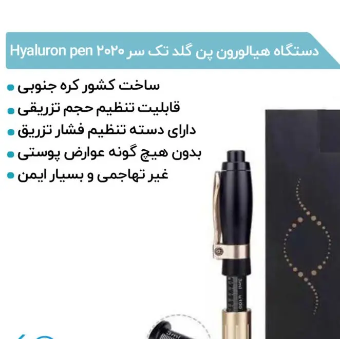 دیدن محصولات مرتبطتزریق بدون استفاده از سوزن و همچنین عوارض ناشی از آن میزان تزریق قابل تنظیم ژل به زیر پوست 3 میل و 5 میل تزریقی کاملا ایمن بدون خونریزی و همچنین سوراخ شدن پوست قابلیت استفاده ی آسان حتی توسط خود فرد عدم ایجاد عفونت و انتقال انواع بیماری ها بدنه ی استیل ضدزنگ تزریق کاملا آسان، ایمن و سریع استفاده از تکنولوژی فشاری برای تزریق ژل به پوست کیفیت بسیار بالای دستگاه و قیمت مناسب ساخت کشور کره