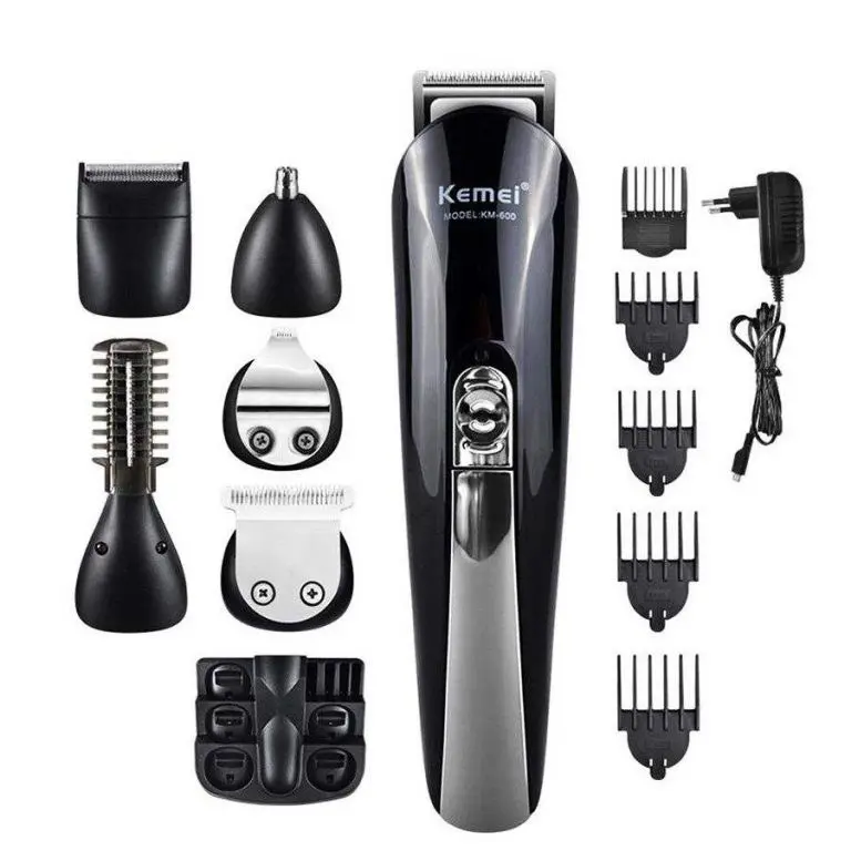 ماشین اصلاح کیمی مدل KEMEI KM-7933یک سری خط زن T شکل، سری موزن گوش و بینی، سری خط زن سایز کوچک، سری مرتب کردن ابرو، سری شیور، سری U شکل، 4 عدد شانه در سایز های 3،6،9،12، آداپتور برق، استند نگهداری، روغن مخصوص، برس تمیز کننده، شانه کار و دفترچه راهنمادارد.