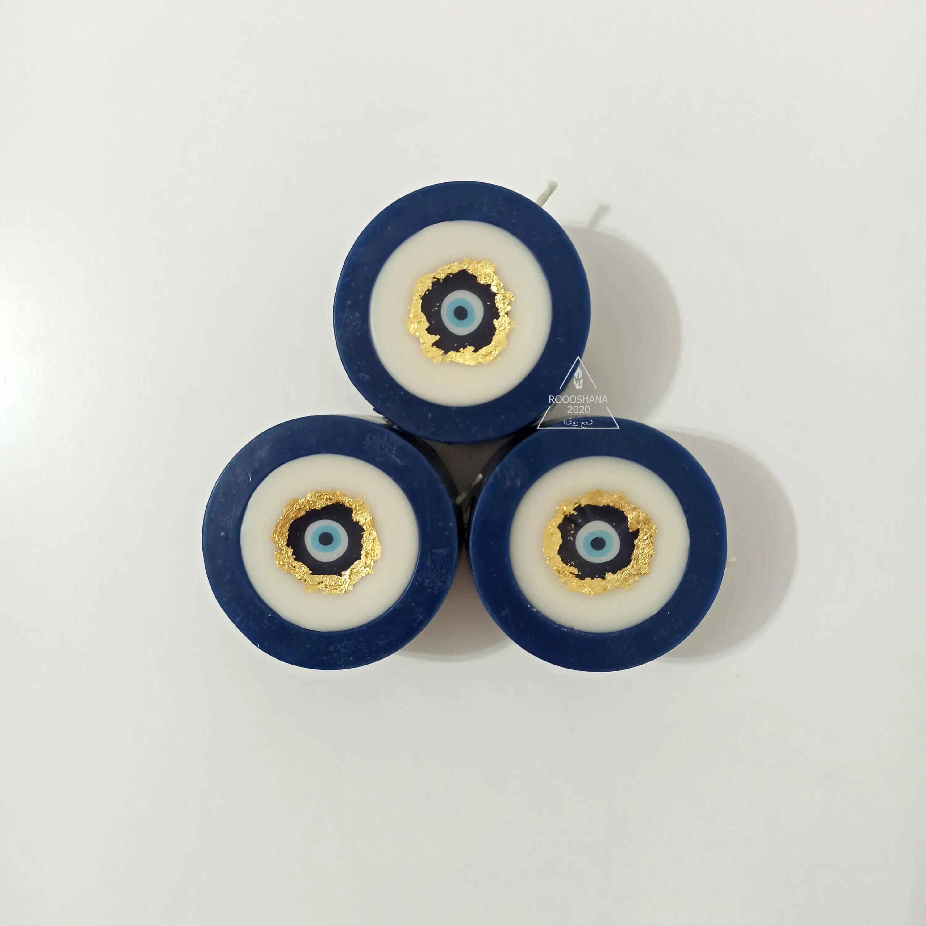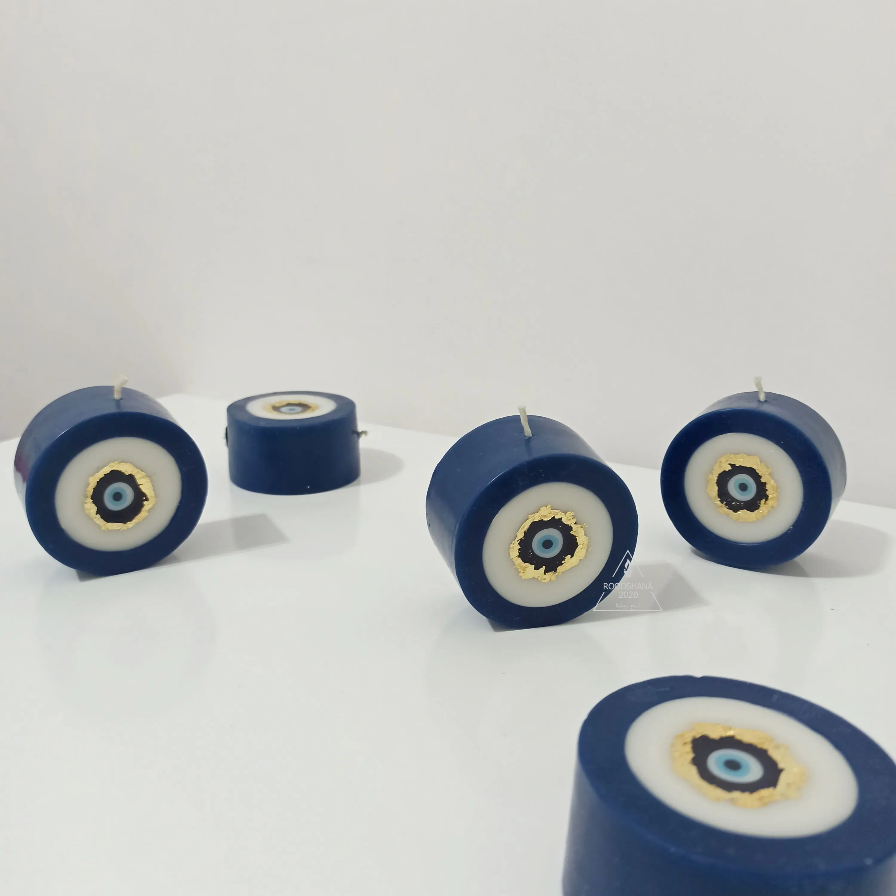 شمع چشم نظر تزیین شده با ورق ط_لا قابل روشن کردن به صورت ایستاده ارتفاع 7 قطر 5