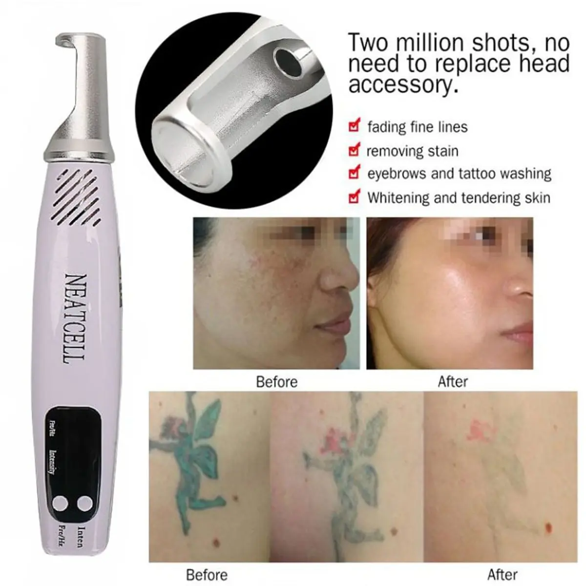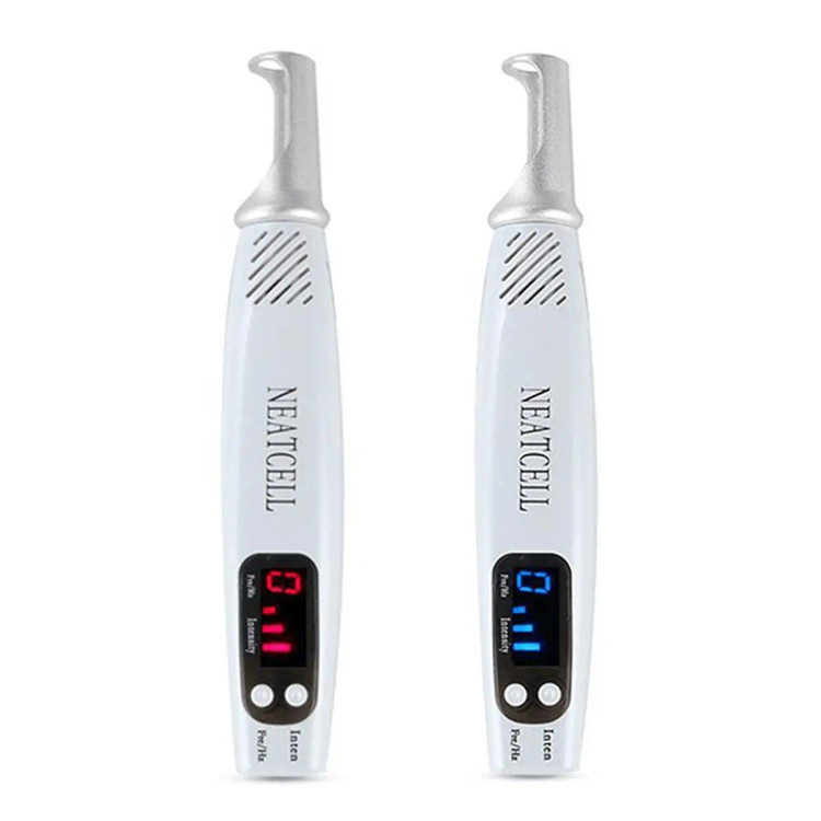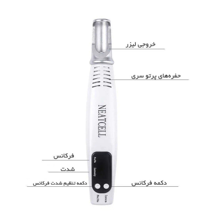 رنگ آبی: برای از بردن خال های ضخیم و قطور ، تتوهای تیره و پر رنگ استفاده از محصول جهت از بین خالهای ضخیم معمولا طی سه دوره انجام خواهد شد. برای از بین بردن خال های سطحی احتمالا طی یک دوره شاهد تغییر و از بین رفتن آنها خواهید بود. سایر ویژگی ها سهولت در استفاده جا به جایی و حمل آسان جوان--سازی و درخشندگی پوست پاک کننده قدرتمند ضایعات پوستی حذف و پاک کردن تاتو ابرو پاک کننده قوی تاتو و خال کوبی روی بدن بدون عوارض و قدرتمند و سریع حذف اشتباهات رایج در تاتو ابرو و اصلاح مجدد تاتو از بین برنده ضایعات پوست حذف لک های پوستی و کبودی ، لکه های قهوه ای حذف خال و کک و مک پوست بدن و صورت دستورالعمل استفاده دستگاه را به برق متصل نمایید تا لوله های دیجیتال نمایش داده شوند( چون دستگاه بصورت مستقیم از برق شهری استفاده میکند). دکمه انتخاب فرکانس را فشار داده و فرکانس مورد نظر خود را انتخاب نمایید سپس اندازه خروجی را تنظیم نمایید. اکنون موقع استفاده از دستگاه لیزر قلمی نت سل است سوئیچ دکمه انتشار لیزر را فشار داده تا از خودش لیزر تولید نمایید(بصورت متناوب و با کمی مکث روی نقطه یا سطح مورد نظر استفاده نمایید. توجه داشته باشید که این محصول قابل شارژ نبوده و با اتصال برق مستقیم کارکرد خواهد داشت. بعد از اتصال برق تا نمایش خطهای استوانهای شکل صبر کنید. سپس لیزر قلمی نیتسل را در فاصلهای مناسب از پوست قرار داده و با فشار دادن دکمه سویچ و پرتابکنندهی لیزر روی نقطه موردنظر، تاثیر آن را مشاهده خواهید کرد. نور این لیزر به رنگآبی بوده و دارای 9 درجه مختلف است و برای تاتوهای رنگی مناسب است. اقلام همراه محصول شامل عینک مخصوص ، دفترچه راهنمای استفاده به زبان انگلیسی و آداپتور میباشد. توجه: هنگام اسنفاده از این دستگاه از عینکهای محافظ استفاده نمایید.